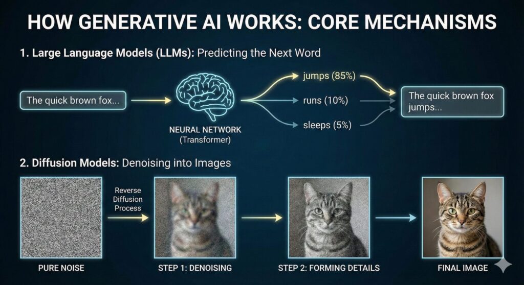 If you ask it to “Paint a cat surfing on Mars in the style of Van Gogh,” it doesn’t search Google for that image. It paints it, pixel by pixel. If you ask it to write a poem about quantum physics, it writes it from scratch. That is the “Generative” part.