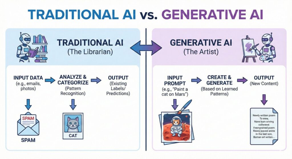If I had to describe the difference between traditional AI (Discriminative AI) and Generative AI in one sentence, it would be the difference between a Librarian and an Artist.