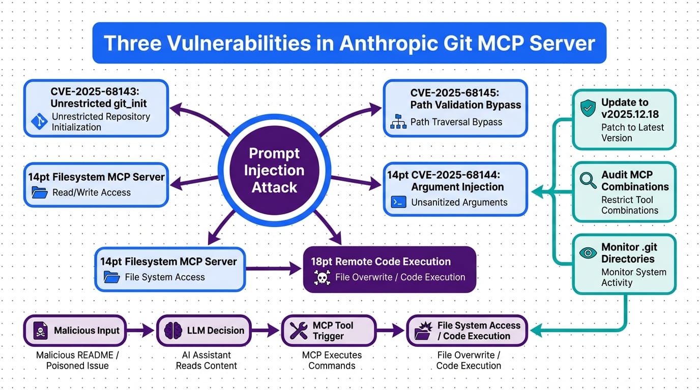 John: Let’s get engineering-real here. The Model Context Protocol (MCP) is like a standardized bridge for LLMs to fetch external data—think of it as plumbing that connects your AI brain to tools like Git. Anthropic’s official mcp-server-git implementation aimed to make this seamless for developers using Claude models. But researchers uncovered three flaws exploitable via prompt injection: basically, tricking the AI into running harmful commands by embedding them in innocuous files like READMEs.