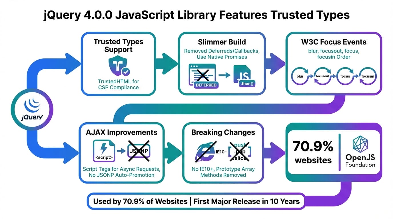 It’s not magic; it’s a deliberate shift to modern web standards. jQuery 4.0.0 trims legacy code, supports only recent browsers (goodbye, IE), and adds these security hooks. The metaphor? It’s like upgrading from an old bike with rusty brakes to one with automatic sensors—safer rides with less effort.