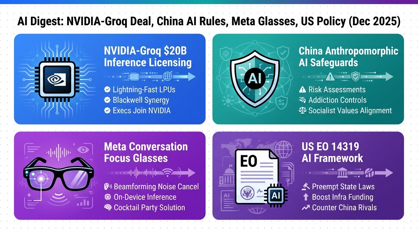 Jon: Alright, Lila, let’s dive into the biggest news kicking off our digest: NVIDIA just announced a major licensing deal with AI chip startup Groq. From what I’ve fact-checked using recent reports, this happened around late December 2025, and it’s not the $20 billion figure floating in some hype—it’s more about strategic licensing and hiring key execs, as per Bloomberg and Yahoo Finance. NVIDIA is licensing Groq’s inference technology to boost their own chips, especially for running AI models super fast. Think of inference like the “serving” part of a meal: training an AI is cooking it, but inference is dishing it out quickly to users without burning the kitchen down.